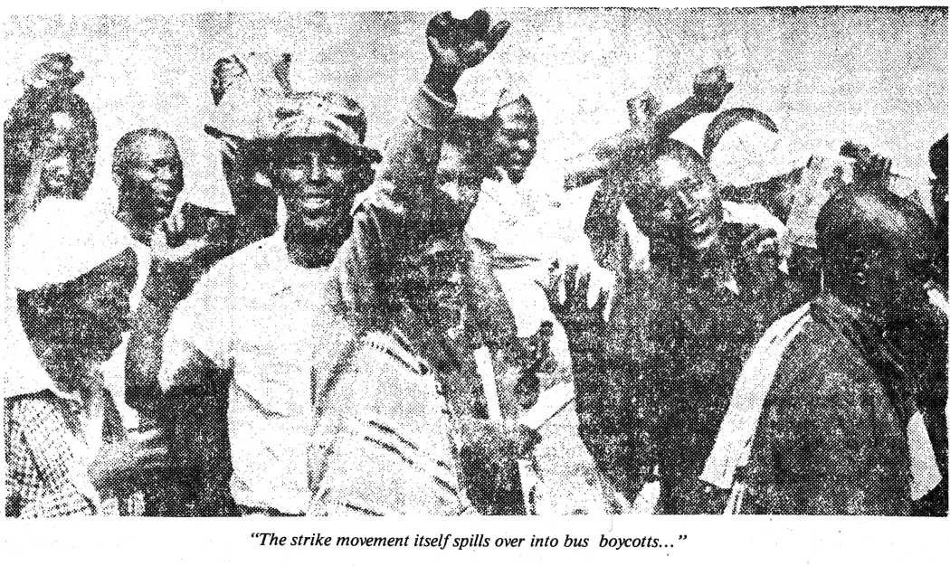 We are witnessing the unprecedented development of strike action on a national scale as the actions in one area spark off those in another: in Port Elizabeth, Cape Town, Durban, again Port Elizabeth and Uitenhage, Johannesburg and East London. These strikes bring back memories of the Natal strikes of 1973 and the political strikes of 1976. But the workers’ movement reaches further ahead with each assault – grasping the future with both hands.